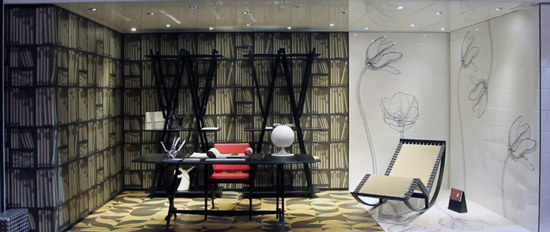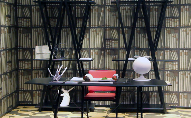 Igloo Design brings together the worlds of work and play within their container space. A wallpaper background of books creates a grid-like pattern within the room to comment on our digital culture and need for constant information.