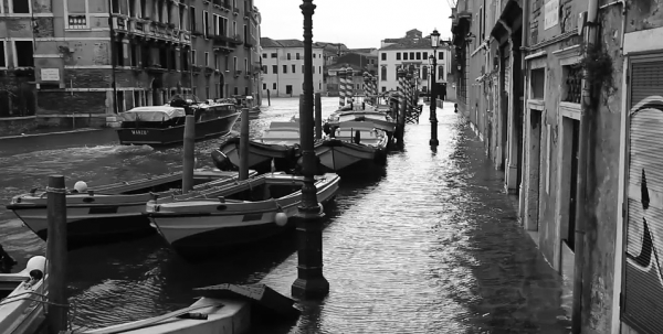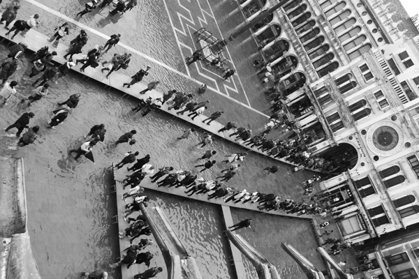 The high tide in Venice, Italy is an occurrence that happens during the winter months. To deal with the rising waters, tourists and residents navigate through the city on raised wooden platforms and sport rubber boots to stay dry.