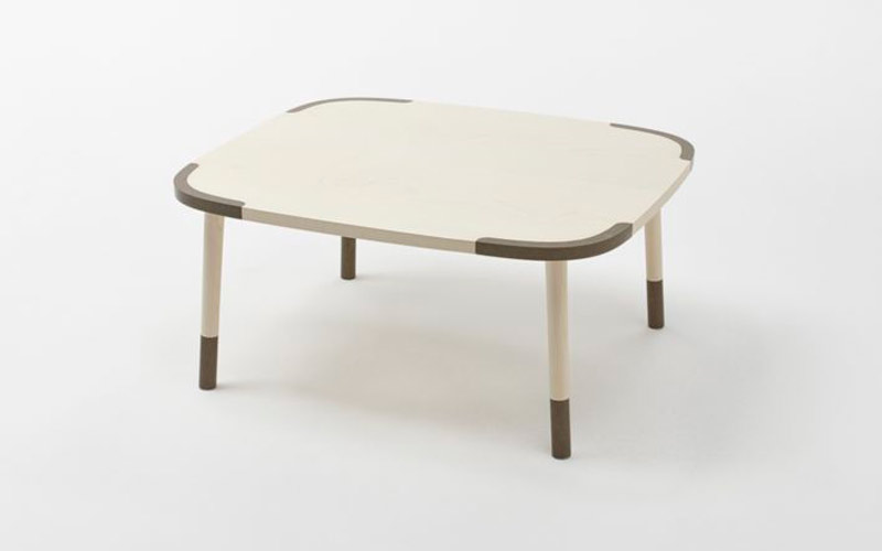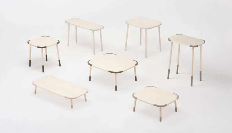 strength of the material. Rather than ostentatiously applying the material to the entire design, we created wooden tables and used Caesarstone to protect the table top corners and feet. The subtle stone elements are incorporated to make the tables stronger while drawing focus to the seamless coexistence with the wood. The seven tables vary slightly in size and proportions, each with a different type of Ceasarstone.”