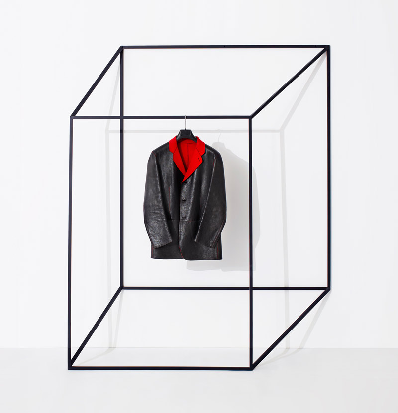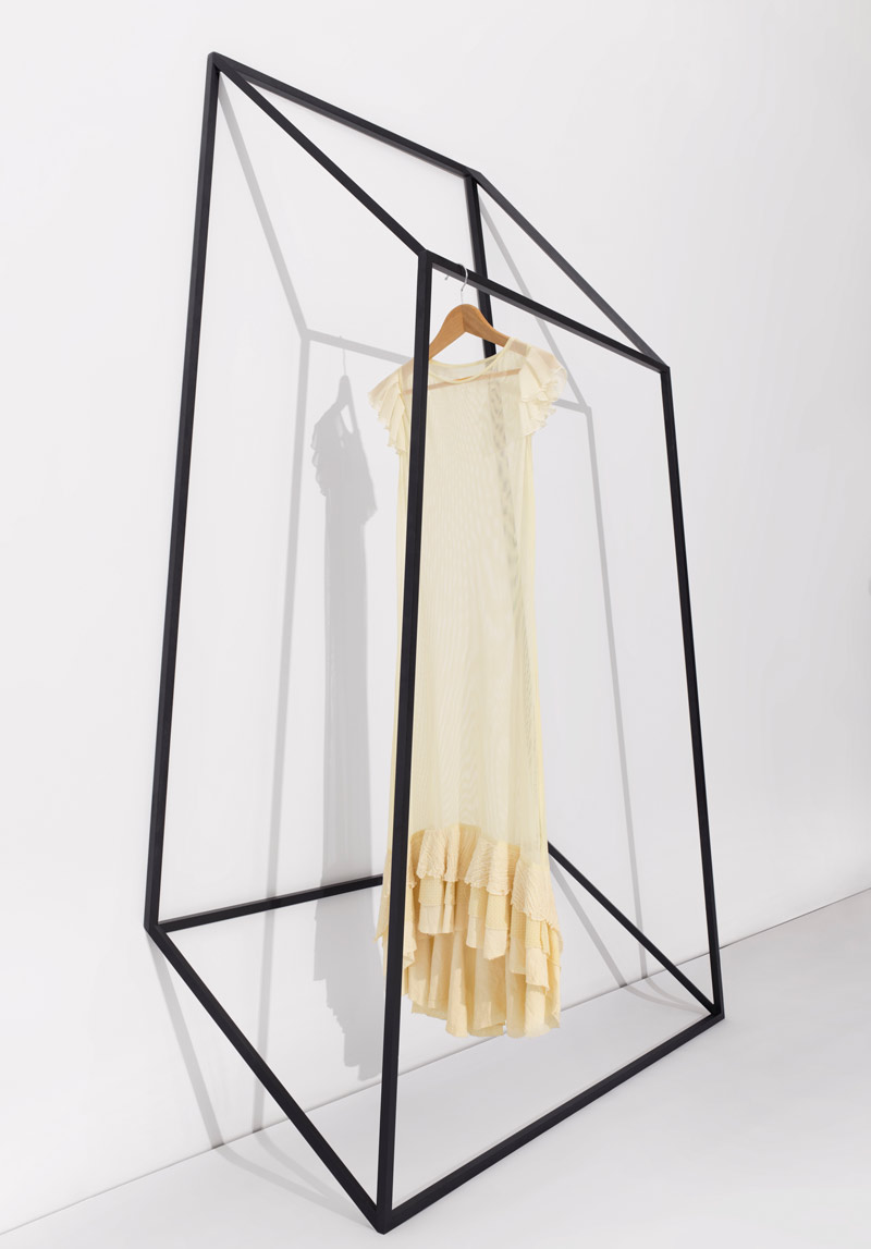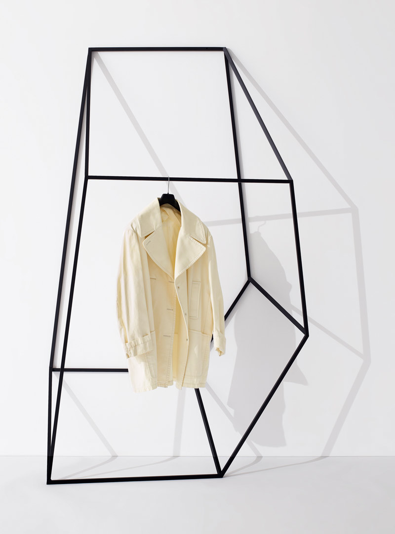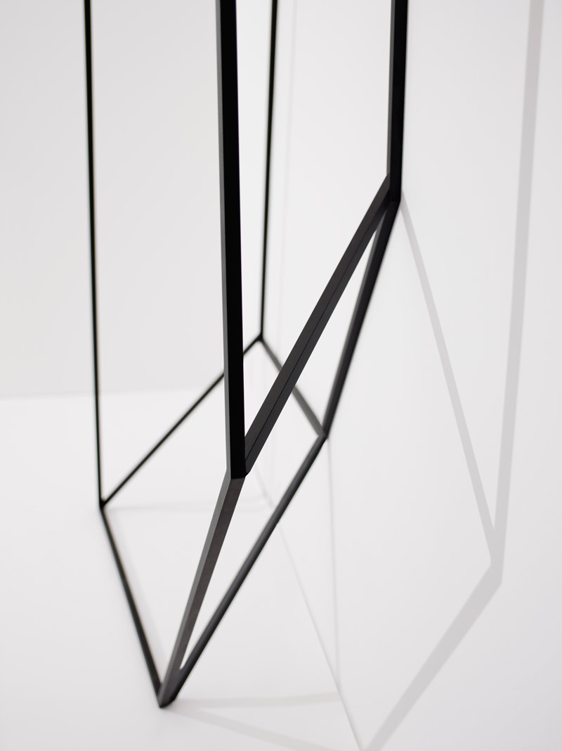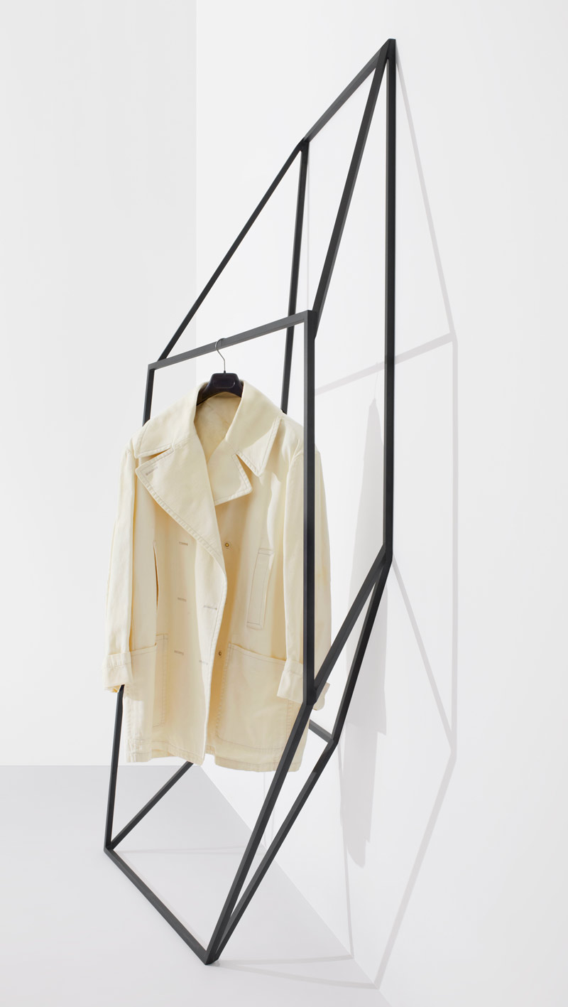 The geometric welded steel collection features 11 pieces, that includes a full-length mirror, a wall-mounted sideboard with glass shelf, a ceiling-hung rack and eight freestanding structures.