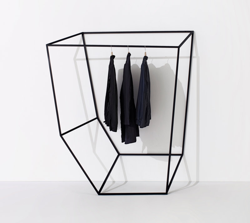 Toronto-based studio +tongtong has designed a series of flexible and playful clothing racks. Les Ailes Noires, which is french for black wings, is a series of shapes that play with the sense of spatial and volumetric perception.