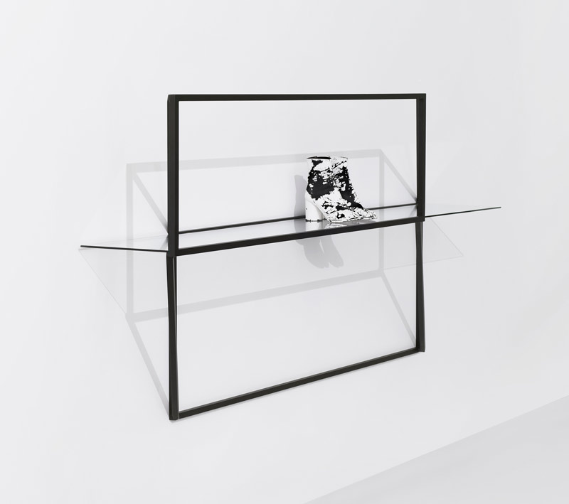The matte black finish accentuates the shape’s spatial ambiguity that fluctuates between two and three dimensions, creating an interplay between light and cast shadows.