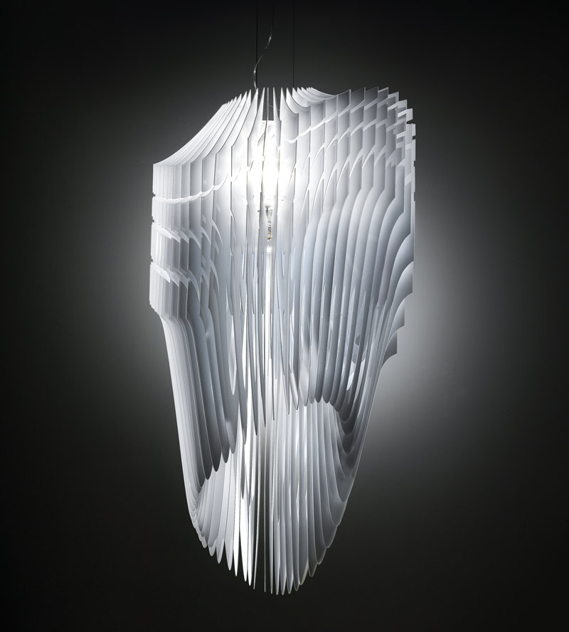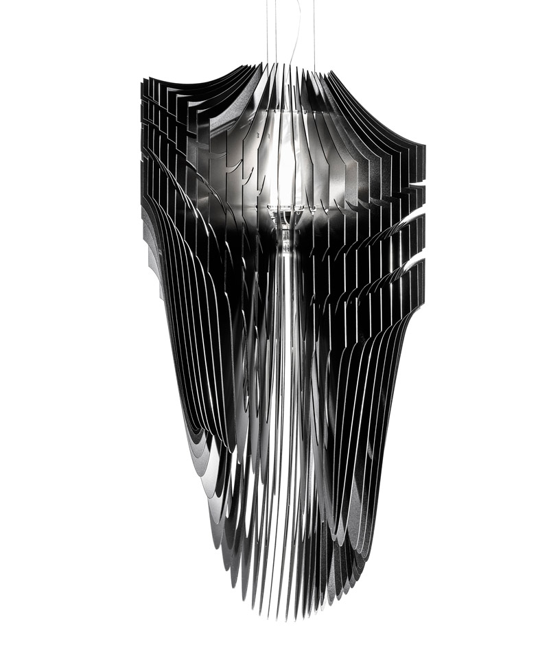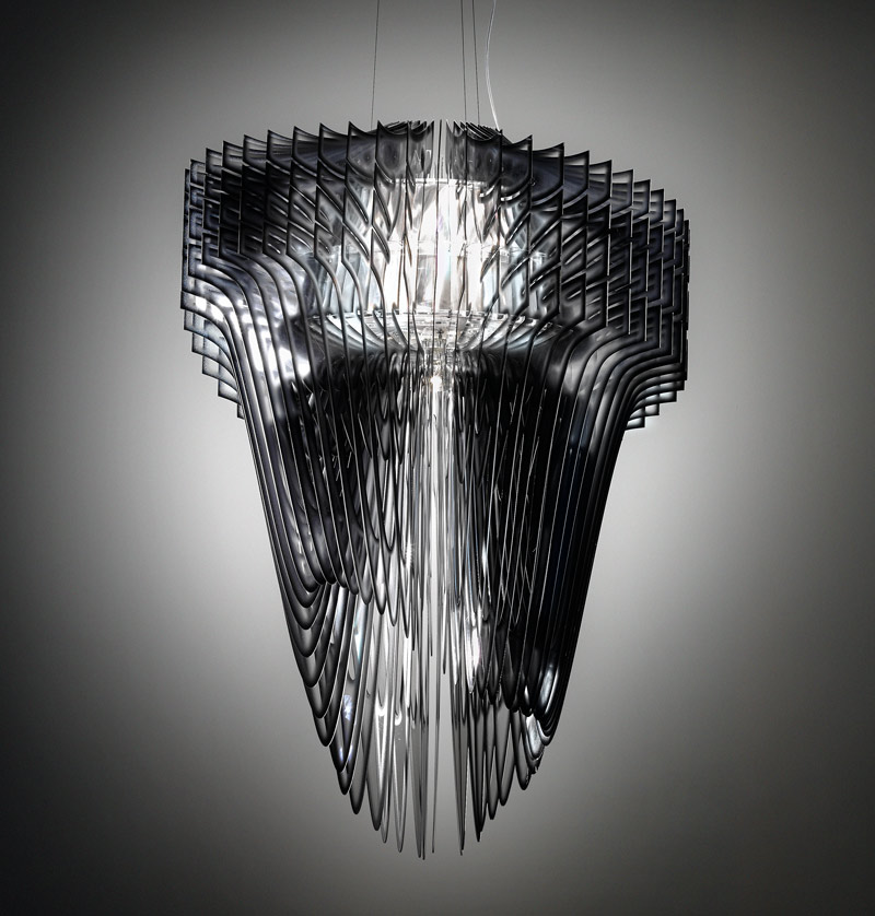 Aria, is a suspension lamp made of 50 layers of Crystalflex®. Standing 130 cm in height and 90 cm in diameter, this piece is charged with a dramatic sense of motion combined with a weightless fluidity.
