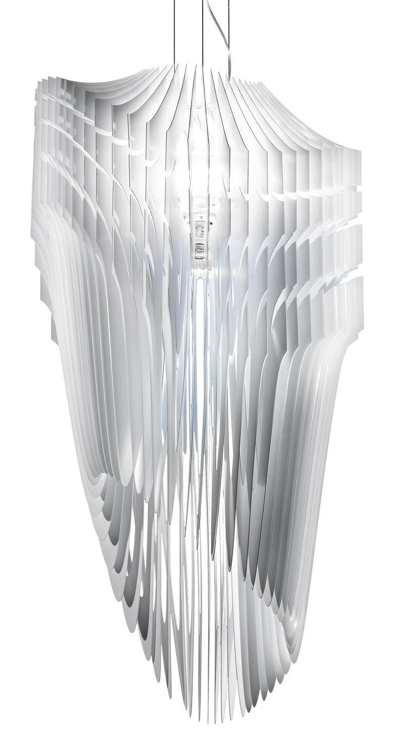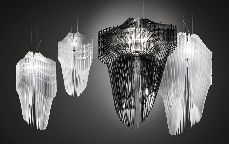 Premiering at this year’s Salone del Mobile, Zaha Hadid has designed two chandeliers for Italian lighting company Slamp.