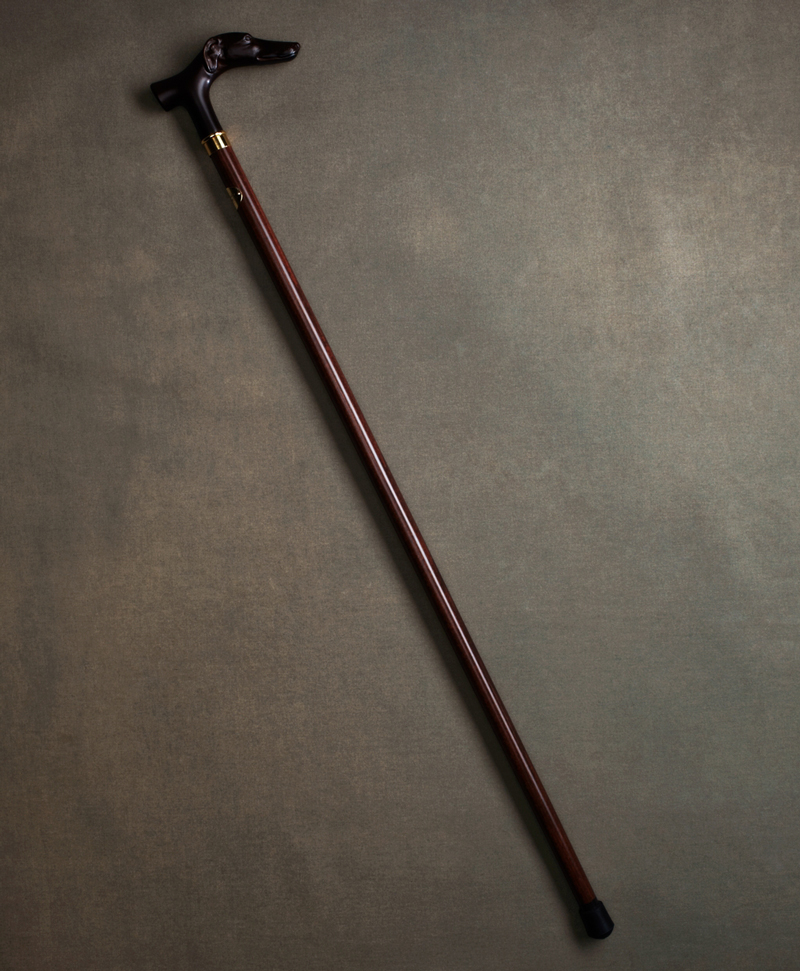 Beechwood cane is topped by an elegant dog head crafted of dark resin. Polished brass ring accent. 34″ long. Made in Italy.