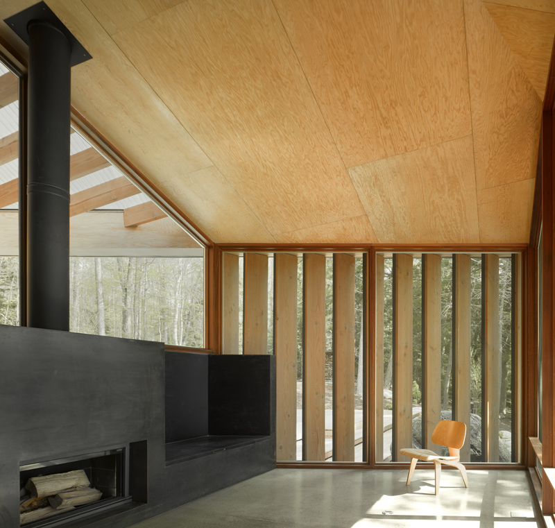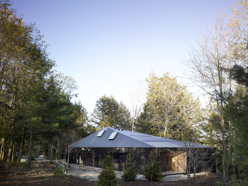 Taking cues from the client’s fondness for Scandinavian fishing shacks, with their pine tar-painted cedar, the building is clad in a black corrugated metal, a cost effective North American interpretation to this shoreline aesthetic. The result is a modern, raw and industrial appearance.