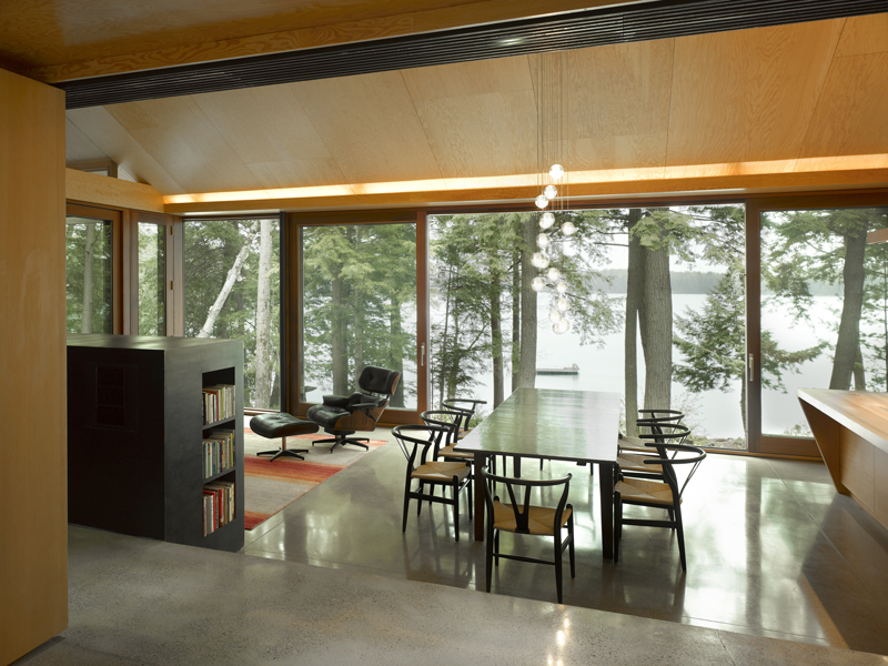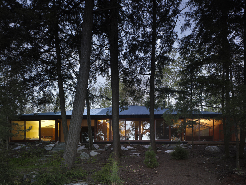 Situated among a quite lake community, this modern four-season cottage stands behind the trees revealing its clean modern lines and connection to the outdoors. The Clear Lake Cottage, designed by Toronto-based firm MJMA, takes on a campsite look through its peaked roof which creates an ambiguously modern vernacular feel allowing for snow and water shedding, accentuating the building’s shape.