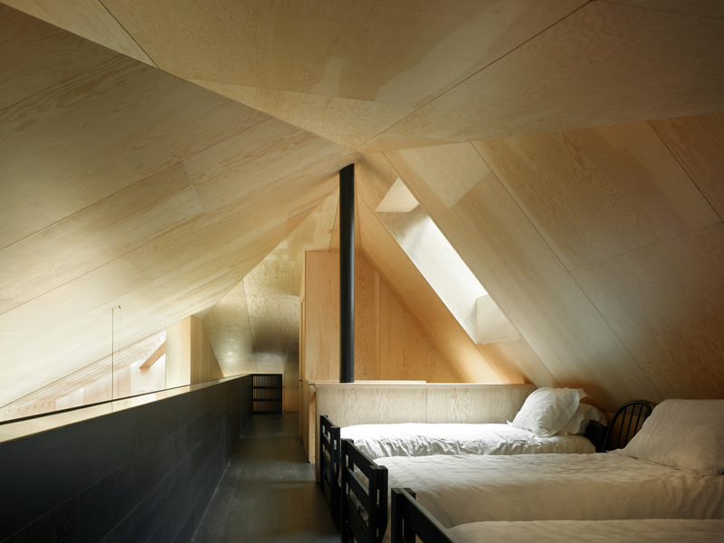 The resulting formal expression of the building resembles an archetypal ‘house’ quality. The roof and walls are merged into a singular streamlined form. The massing along the forest side is connected vertically with the above open loft space.