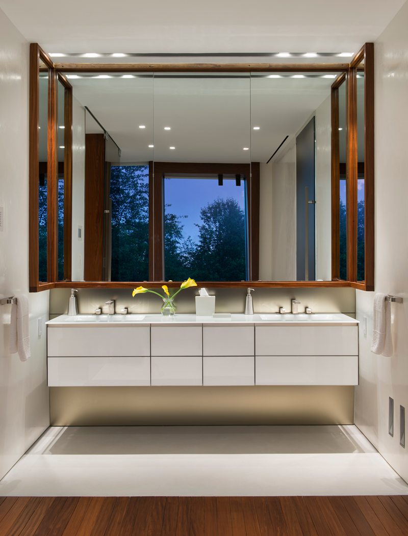 It is clad in the same afromosia wood as the stair landing. The quiet elegance and clean lines of the house are accentuated by the materials that also include poured-in-place concrete floors, Calcutta marble cladding and afromosia millwork.