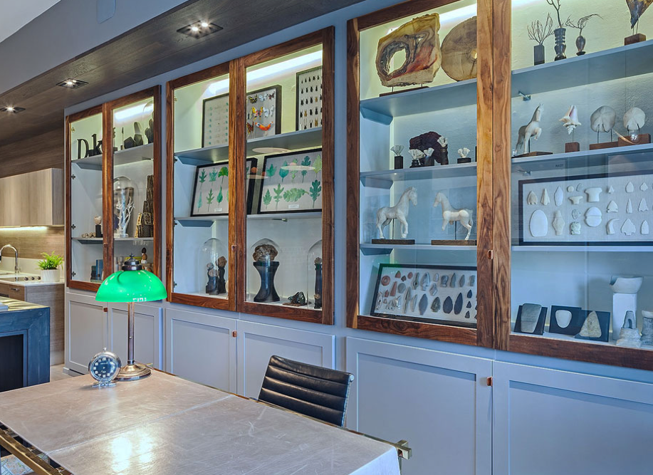 Careful consideration was also paid to the interior architecture of the presentation centre to act as a backdrop for the bespoke creations. Wall paneling, the use of graphic printed wall tiles, natural stone and subtle variations of wood creates a layered environment of texture and pattern for the diverse mix of furnishings and artwork.