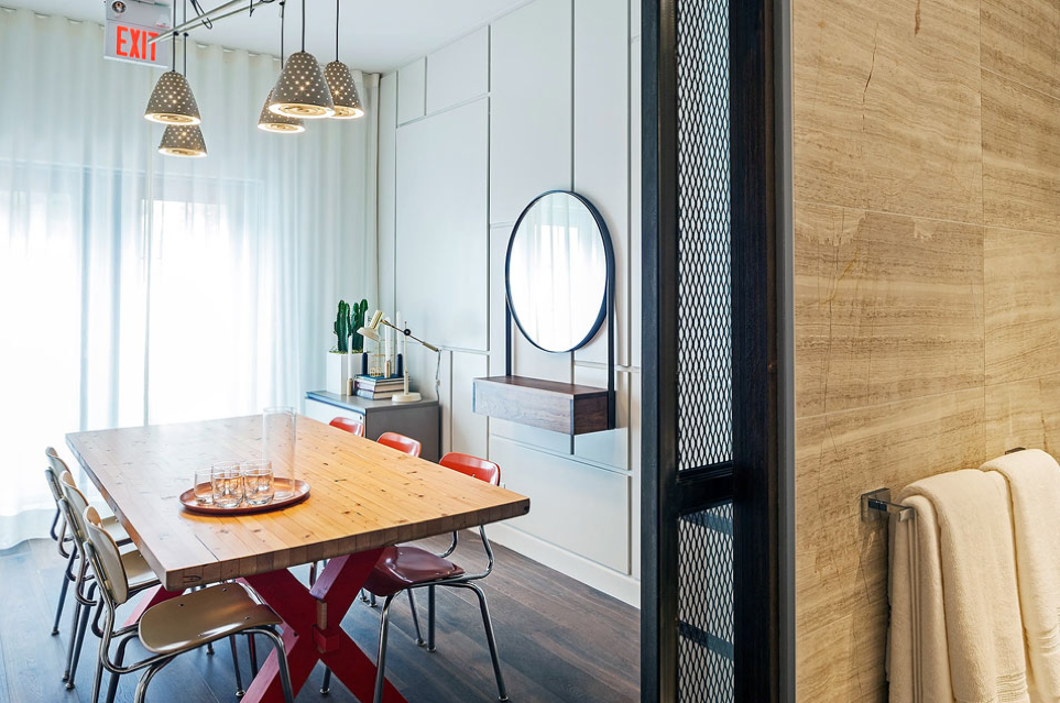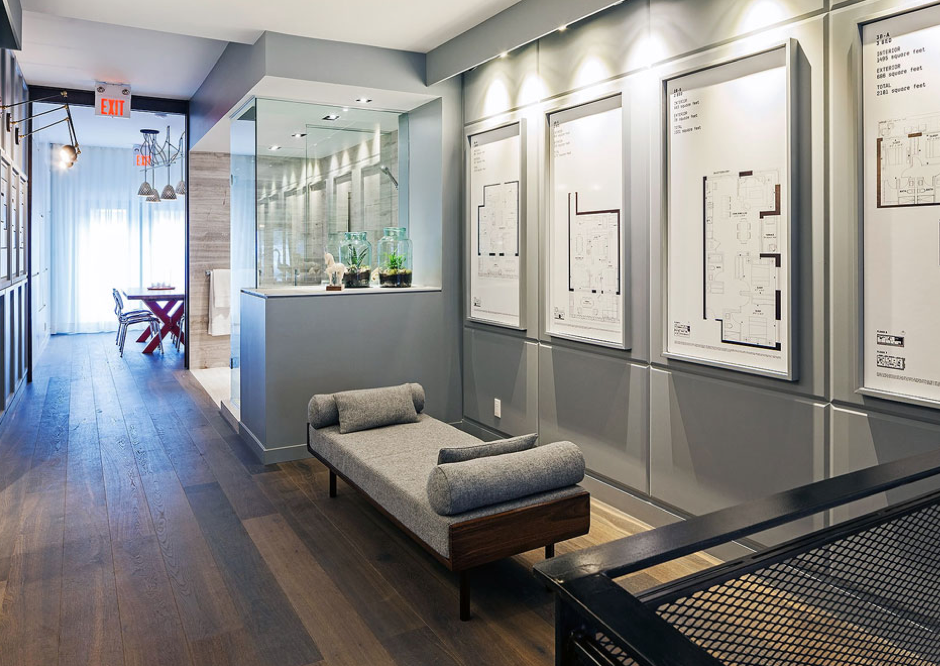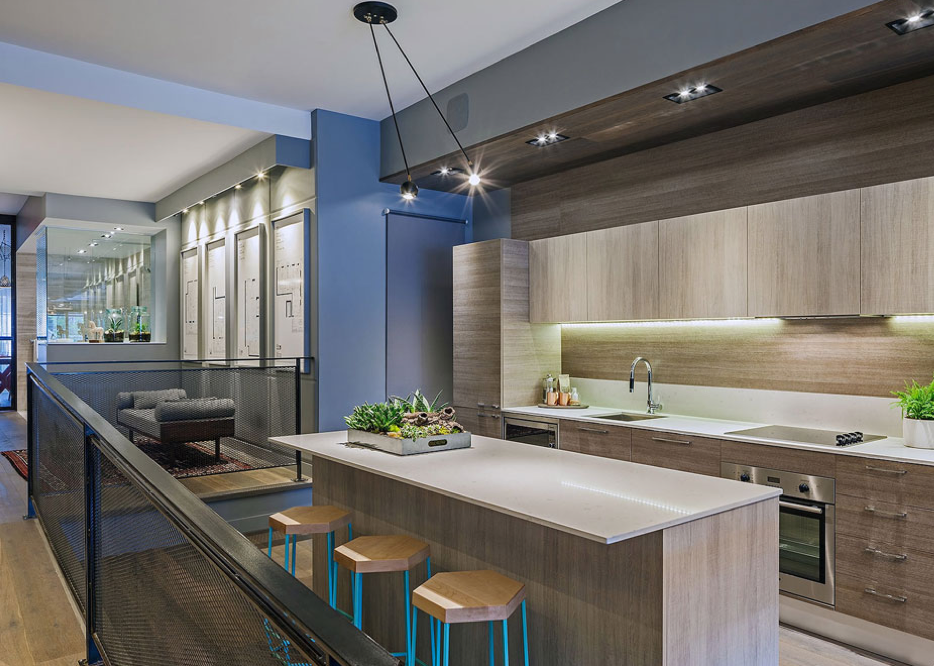 As you walk past the model, and towards the kitchen, subtle furnishings help anchor the space such as the leather reception desk and turquoise island stools by Discreet and Discrete. The upper area features a walnut daybed and an accompanying wall mirror by Heidi Earnshaw. This section allows the visitor the opportunity to relax and enjoy the eclectic arrangement of artwork and videos of the neighbourhood and project. To highlight the informative elements of the space, custom lighting pieces of varying materials were designed by Paul Campbell and Eclectic Revival.