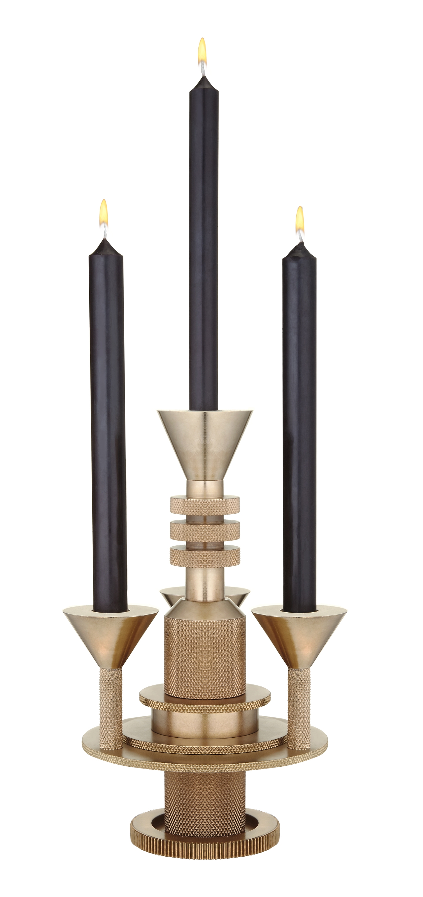 Cog comprises candle holders (medium and large), tea light holders (cone and cylinder), containers (small and large), a candelabrum and a desk tidy.