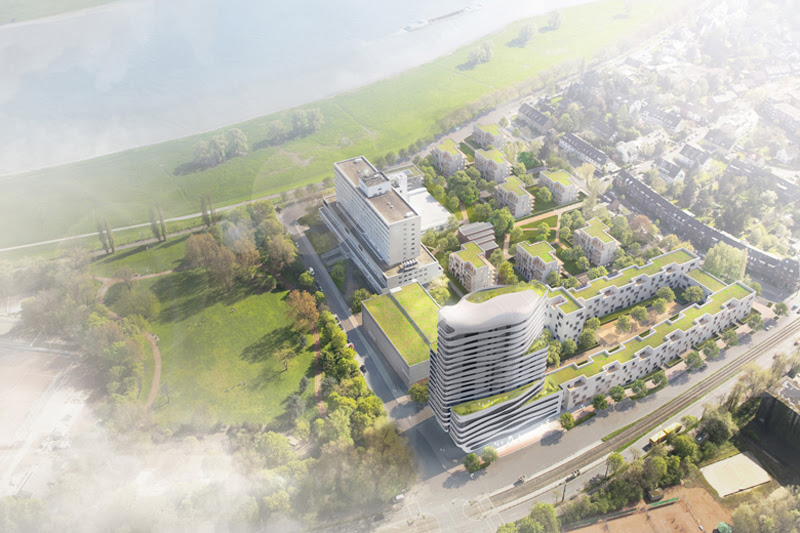 In direct proximity to the sweeping landscape of the Rheinaue and with a view of Düsseldorf’s city center, this high rise will shape the silhouette of the left bank of the Rhine, not only in terms of its architecture, but in terms of use as well. The façades are designed as cloud-shaped, horizontal waves that shroud the building like a gown, lending it a light, sculptural character. The three-dimensional, perforated, and semi-transparent façade elements direct views inside and out and protect from the sun and wind. The planting of the terraces and balconies will improve the microclimate and provide a natural atmosphere in combination with the adjacent generously open spaces.