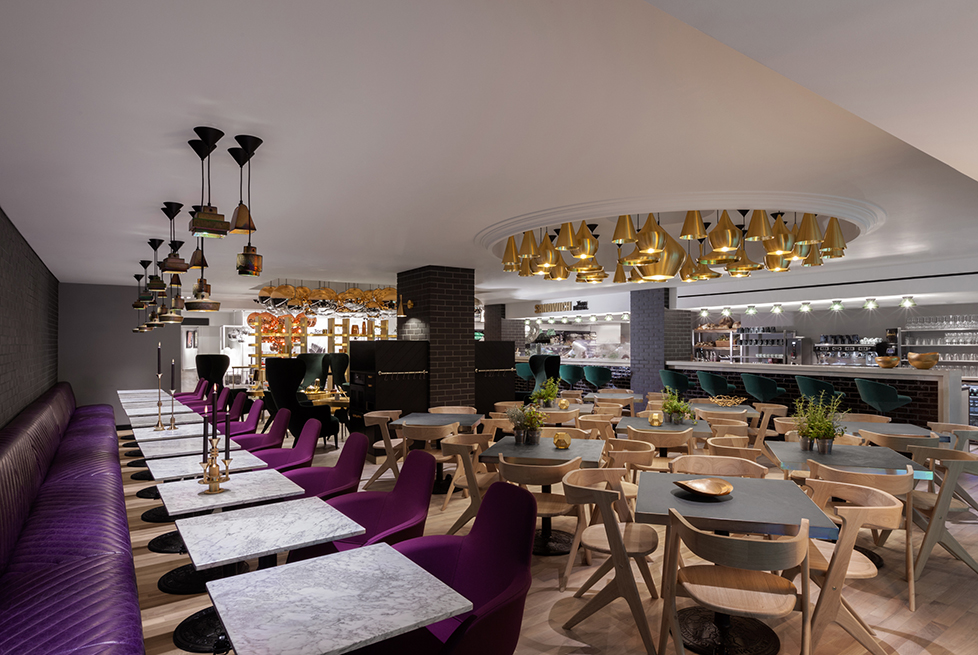 Tom Dixon Sandwich is furnished with the latest innovations in brass lighting and deeply upholstered club chairs, marble clad tables and pierced metal screens, all from the Tom Dixon collection and some previously unseen. The result is a gastronomic oasis literally sandwiched between the two Tom Dixon furniture concessions on the third floor.