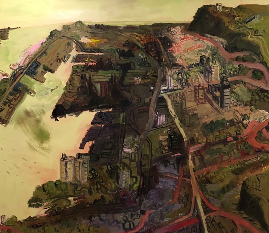 The exhibition actually starts outside of the gallery, on the wall as you arrive at the top of the stairs. Dundas-based artist John Hartman, known for his aerial views was the piece that would begin the conversation.