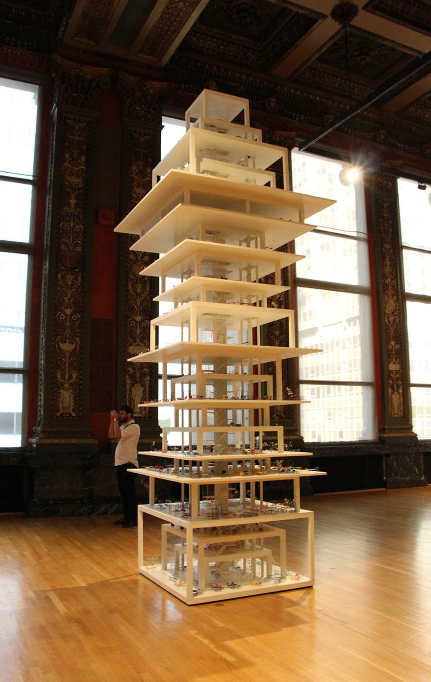 The 2017 Chicago Architecture Biennial eschews drawings for the exhibition format. Each tower design is represented as a scaled model 16 feet high. The towers reflect formal explorations of the tower type: exquisite corpses or as-found objects with new scales and material tests.