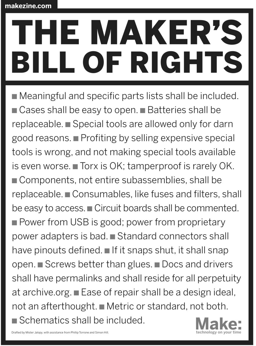 Published by Make: in 2005, the Makers Bill of Rights articulates a list of 17 commandments that manufacturers should follow to make their products repairable and hackable. This manifesto is for those who want the freedom to tinker with, remake, repair, recombine, and upgrade the things they own. By advocating for an open, and resilient product system means disrupting the current model, creating a new context for a more evolutionary, collaborative, and dynamic product system that will help us better fit into earth’s ecosystems.