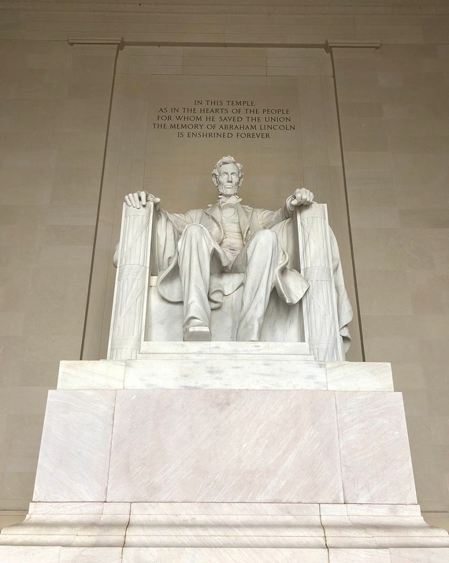 Within the interior etched into the wall, is a memorable quote: “In this temple, as in the hearts of the people for whom he saved the Union, the memory of Abraham Lincoln is enshrined forever.” Below the quote sits a 19-foot tall, 175-ton statue of President Lincoln, himself looking out over the Mall of the country that he fought so hard to preserve and unite.