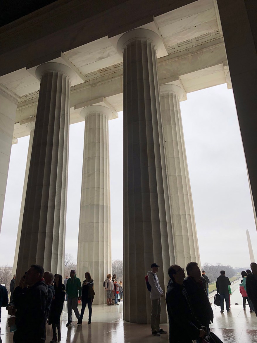 The handsome marble columns are surrounded by greenery – a design inspired by ancient Greek temples. There are 36 columns, each one representing one state in the U.S. at the date of President Lincoln’s death. From the chamber of the memorial, one can appreciate the different stones used in its construction.The terrace walls and lower steps comprise granite blocks from Massachusetts – the upper steps, outside facade, and columns contain marble blocks from Colorado – the interior walls and columns are Indiana limestone – the floor is pink Tennessee marble – the ceiling tiles are Alabama marble – and the Lincoln statue comprises 28 pieces of Georgia marble. These building materials may seem random, but Henry Bacon specifically chose each one to tell a very specific story. A country torn apart by war can come together, not only to build something beautiful but also explain the reunification of the states.