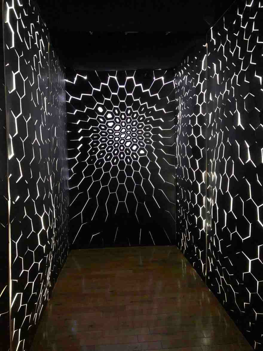 Fraktur by [R]ed[U]x Lab explores expansion and contraction and how they can make a static room feel alive. Fraktur breathes life into an otherwise dark and confined space. Akin to the mechanics of organic beings, Fraktur creates the sensation of breathing that is naturally associated with life and its reaction to humans. It may evoke fear, claustrophobia, curiosity, or maybe even comfort as visitors enter the room. As soon it senses the presence of a wanderer, it reacts defensively. The walls begin to breathe and expand, occupying a greater amount of space. Glowing cracks are revealed in its once uniform jet-black skin as it attempts to interact eerily with the foreign entity. One may feel as if one has entered into the belly of a beast as the pulsating walls close in.