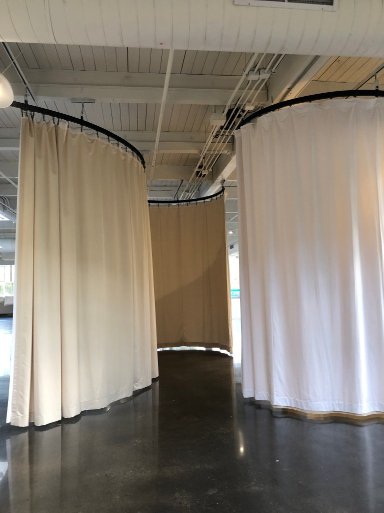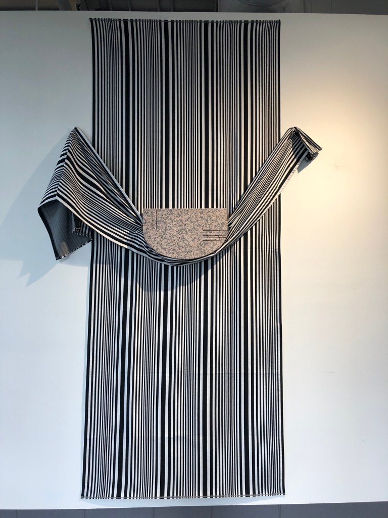 Two rippling fabric curtains suggest the meeting of tectonic plates. According to Kiwanga’s research, the African plate is slowing moving toward and above the Eurasian one, which is subjecting at a rate of approximately two centimetres per year. A rock cradled in fabric hung on the water further problem these thematic currents.