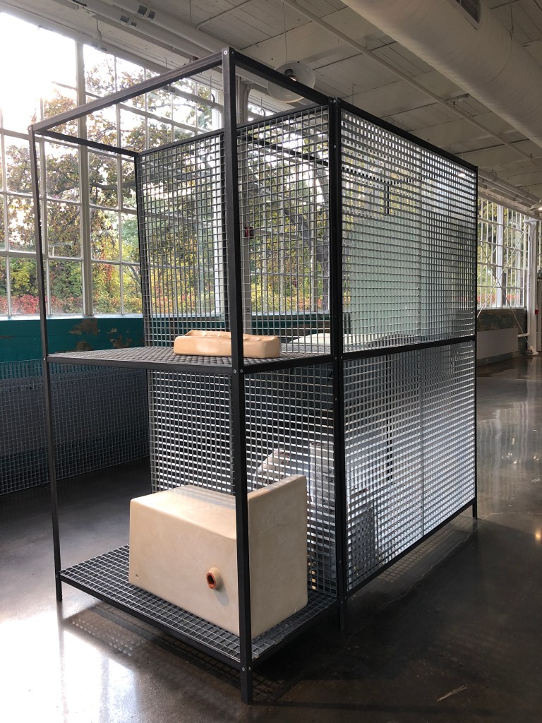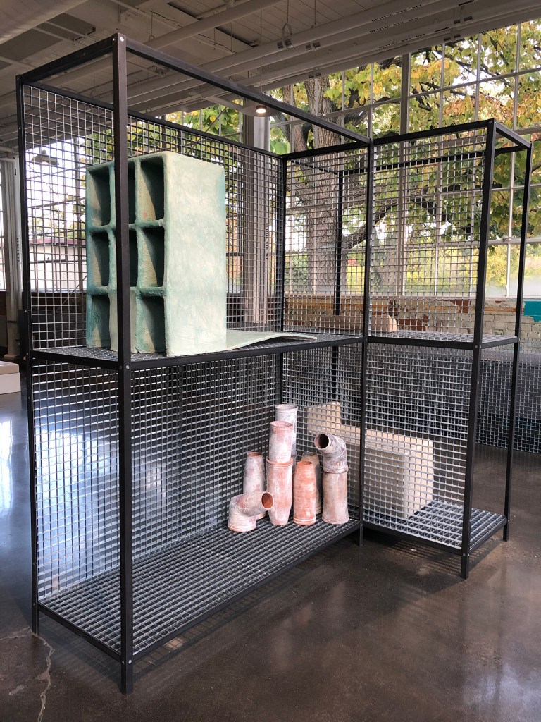 Manna’s work draws formal inspiration from khabyas, traditional seed storage vessels that were a key feature of rural Levantine architecture, paired with metal structures used in industrial storage systems. Manna’s vessels extend her insightful explorations into the transformation of systems of sustenance and knowledge from practices of survival to centralized economies of capital growth.