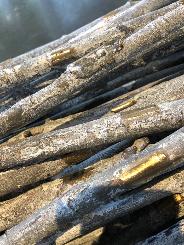 Study for a Garden consists of a stack of sharpened sticks cast in bronze. They might be posts for a garden fence, a faggot (a bundle of wood to fuel a fire), or a collection of crude spears for battle. Praised for its strength and ductility, bronze has long been used to make weapons and monuments. Akhavan has described bronze as both “an obedient and disobedient material,” suggesting that working with bronze follows a logic and life all its own. Titled a “study,” the work subverts the material’s relation to monumentality and permanence, focusing instead on its mutable qualities and alchemical associations.
