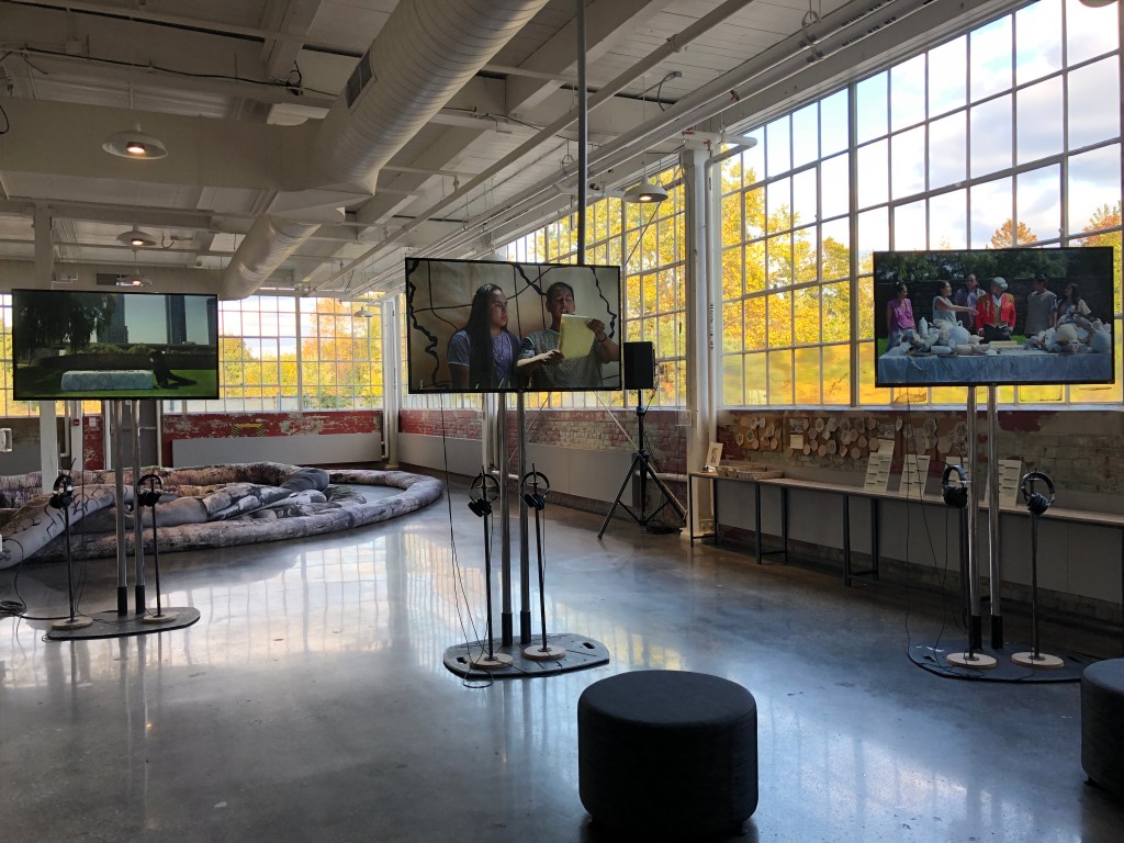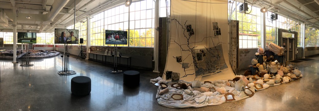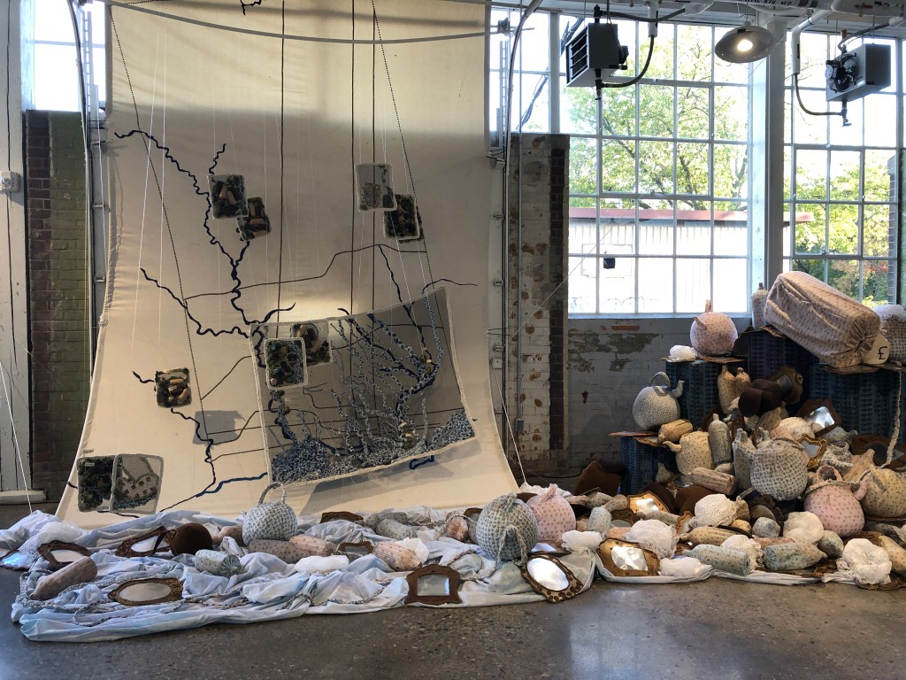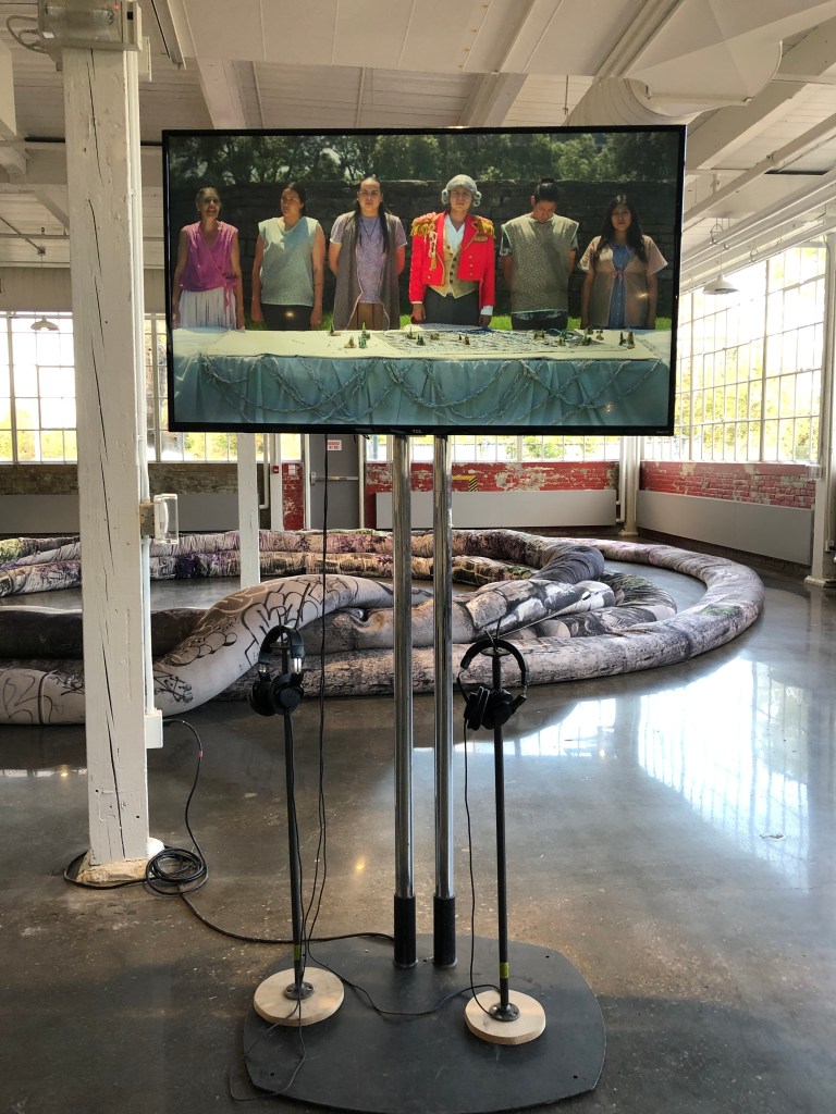 Talking Treaties is an outdoor pageant, workshop, and now installation that shared knowledge about the Toronto region’s treaty history. Focusing on Treaty 13, this project includes a film of Indigenous knowledge-keepers, a graphic novel, rhythmic text and song, soft sculptures, and a textile map. In this iteration, participants are invited to generate their own principles of treaty-making. An activity book and ongoing program of activities and events enable audience members to exchange ideas and information with our various human and non-human relations.