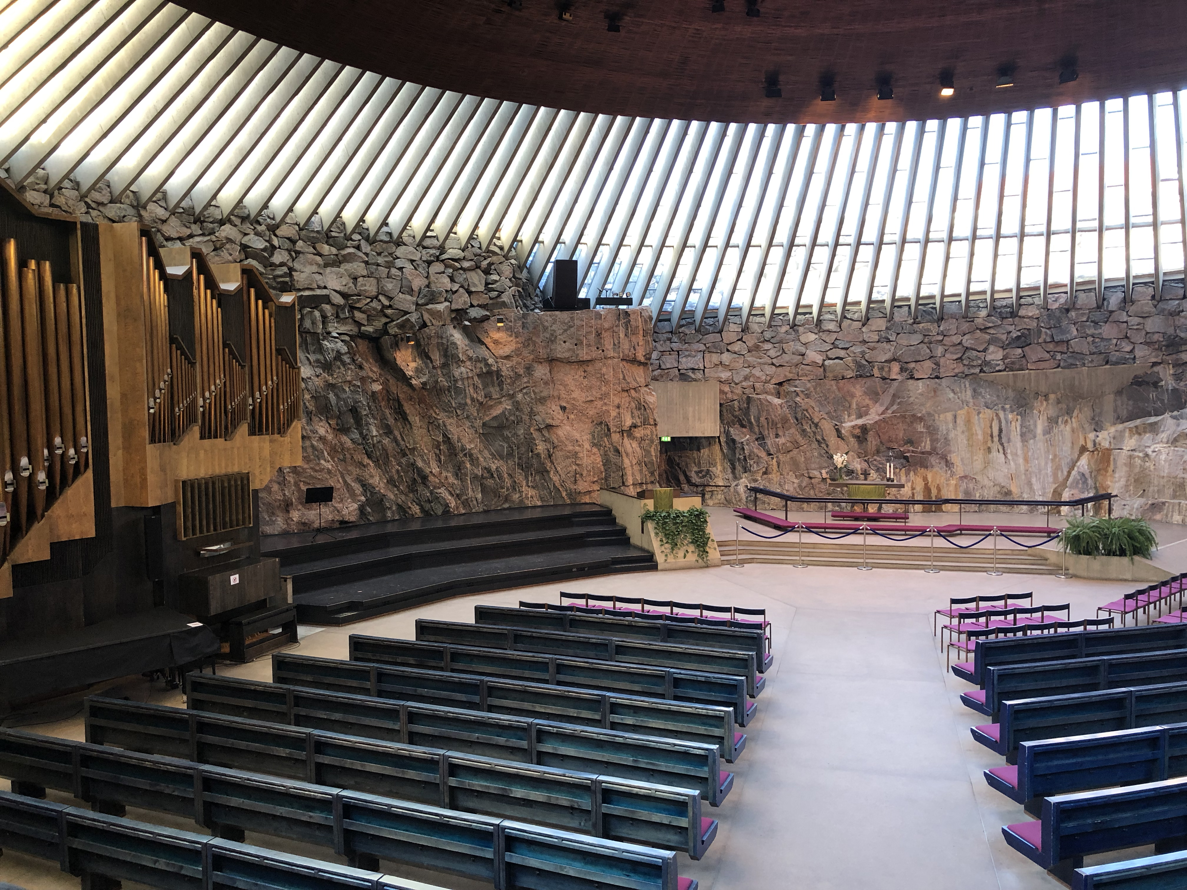 From a contemporary structure located in the middle of the city to one built into solid rock. Built into the bedrock, designed by Timo and Tuomo Suomalainen, is a place of worship is accessed from the street level. The elliptical church hall is bathed in daylight, which passes into the hall from the narrow skylights between the rock wall and the copper ceiling dome. The inner surface of the dome is clad in copper tape requiring a length of 22 km. the diameter of the dome is 24 meters, and the highest point is 13 meters from the floor. The excavation surface of the walls has been left rough for acoustic and aesthetic reasons. Water trickling from cracking in the rock, which is led away along channels proceeding under the floor, adds vibrancy to the stone surfaces. The height of the walls is 5-9 meters. The altar wall of the church hall is split in the rock dating back to the Ice Age. The altar table is granite, the floor of the hall is polished concrete and the pews are made of birch wood. If you appreciate the sheer beauty and materiality of creating a structure like this, I would recommend going to the upper level to get a really breathtaking view of the whole interior in its glory.