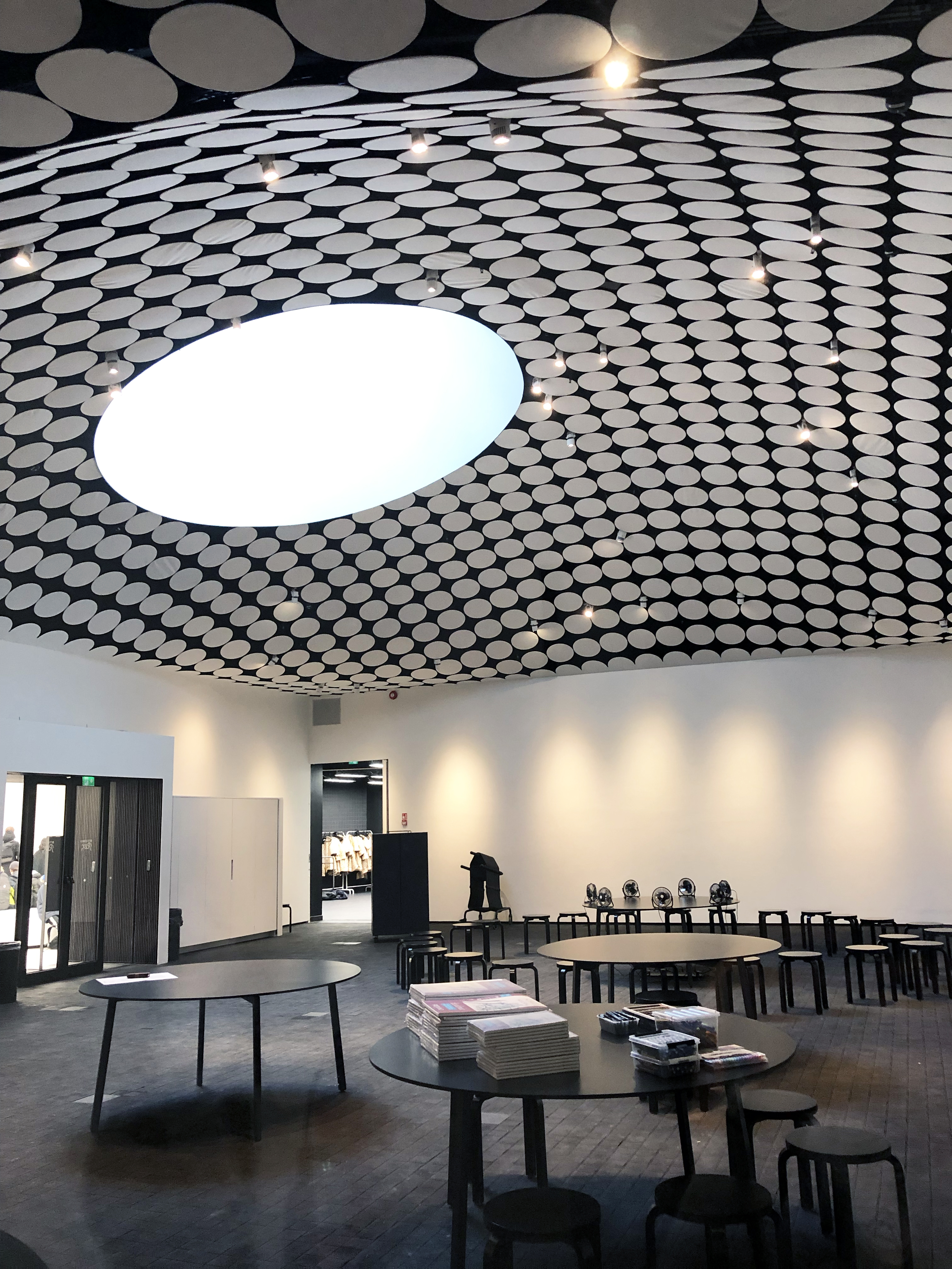 The domes were cast on-site out of steel-reinforced concrete which spans the new exhibition galleries. Their vault shape is structurally optimal and allows for wide, pillar-free spaces, for which flexibility is of crucial importance. The skylights that intentionally open in specific directions look out onto recognizable details of the surroundings, such as the chimney in the middle of the Square. Creating a peek-a-boo concept and link between the subterranean museum and the surrounding city. What I particularly liked about the design was how the repetition of circles was carried throughout the space. Not overly done and yet cleverly positioned. The bathroom is worth taking a peek at.