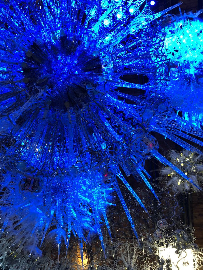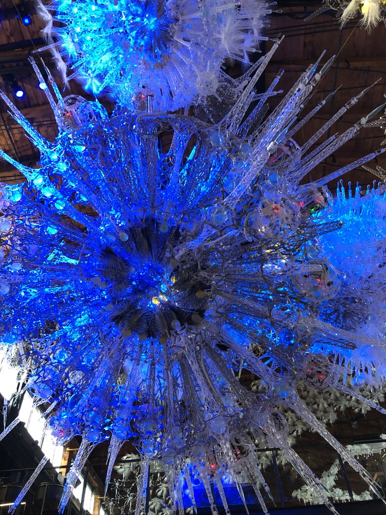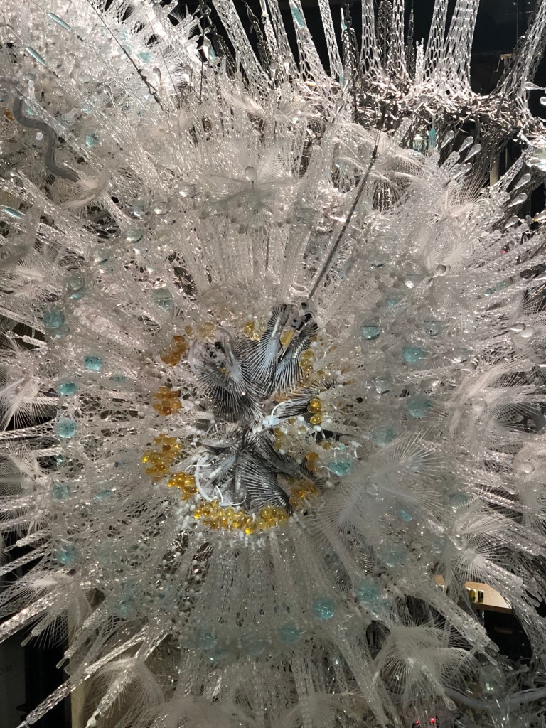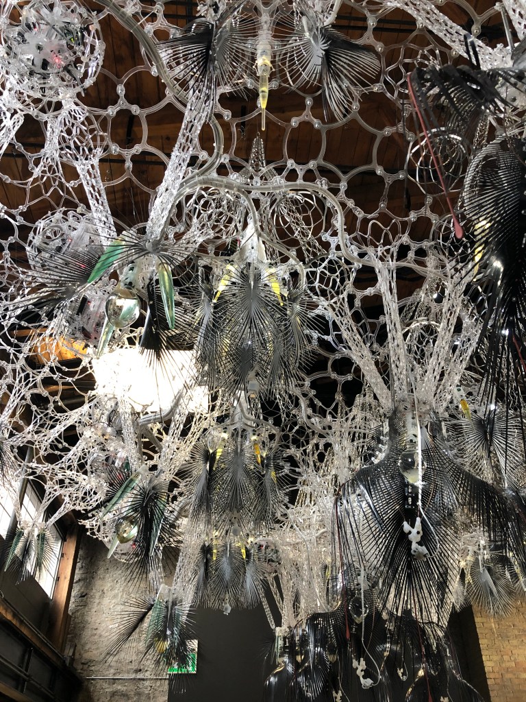 Meander took about a year and a half to make it. Maybe about two years. We started with several months of rather intensive design using digital prototyping and making of samples. Then we made large patches in the studio and hung them up and started engineering them. We deliberately destroyed some things and found out how fragile they were and how they could be durable. We have practiced ways of putting them together. Then using very small industry of farm of printers and a few laser cutters and some thermal forming using very small stretching jigs, we manufactured the elements. Then we spent about four months building. And starting in the fall a year ago. Of course, the pandemic has affected that but that involved great arcs of hanging cords fitted into the beautiful industrial hall of the Tapestry Hall, the original textile mill and then setting up scaffolding and then setting wiring in the trunks and then laying in the mechanisms and the glass and then programming it with upper routines and the sound and lighting that you can now see.
