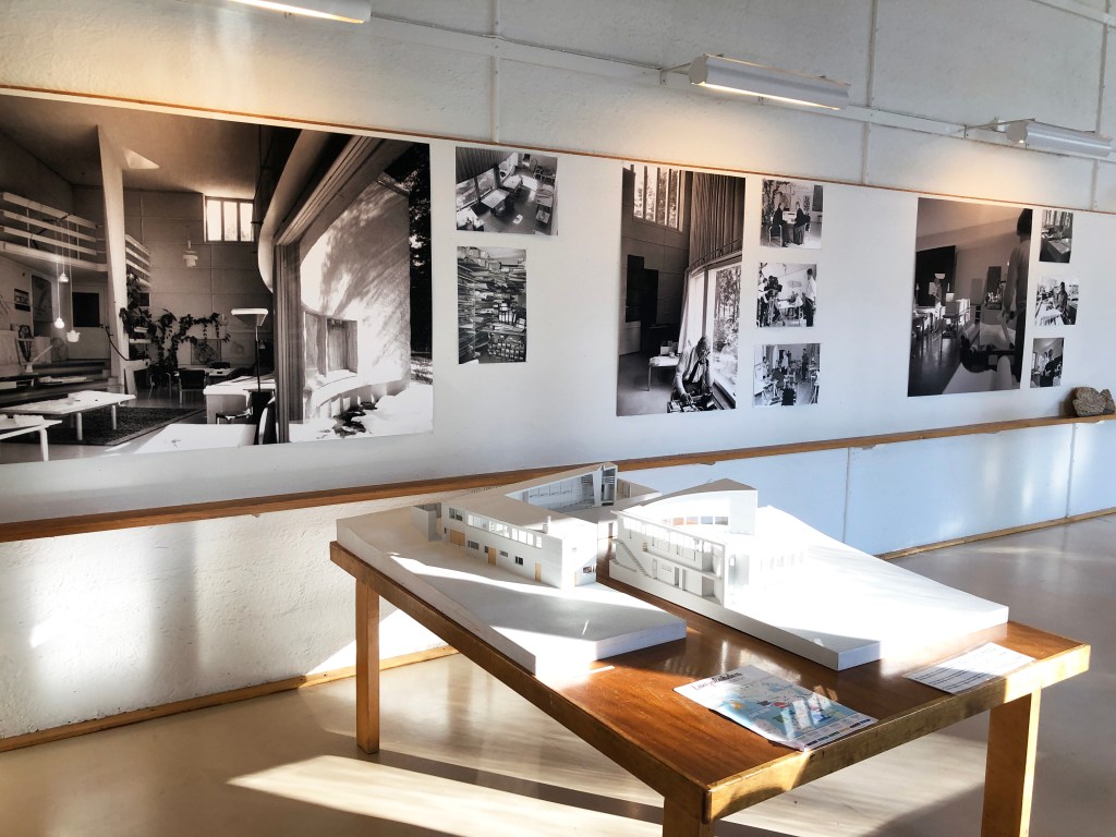 The principal space in the building is the curving studio which has a view opening onto the courtyard. Horizontal battens fixed to the high walls of the studio allowed drawings to be displayed there. The rear wall is covered with climbing plants reaching up to the high-level windows and prototypes of light fittings designed by Alvar Aalto are hung in front of the wall.