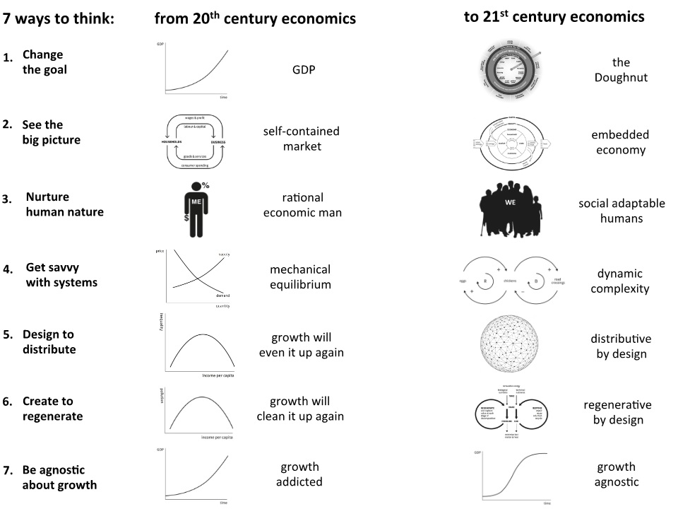 In Raworth’s book, it takes up a challenge to set out seven mind-shifting ways we can all learn to think like a 21st-century economist. It’s all about replacing the old with the new. Now, these are big ideas and I’ve quickly summarized them below. I would encourage you to read the full book to really understand the nuances that each point brings to light, to start thinking like a 21st economics.